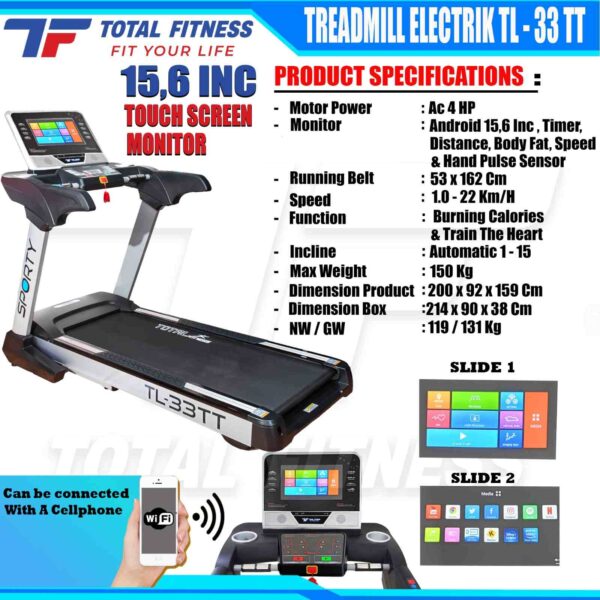 Treadmill elektrik komersil keluaran terbaru type TL-33Ac merk Total Fitness. Model mewah, elegen dan profesional. HARGA BERSAHABAT.